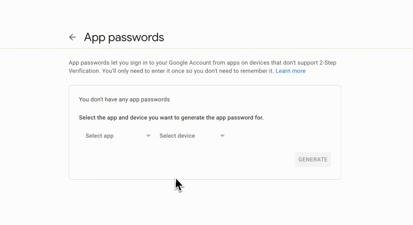 Google will verify your ownership with this app password. Select "Other (Custom name)" under app, and type "ImprovMX alias" as the name. Hit "Generate". Copy and keep for later!